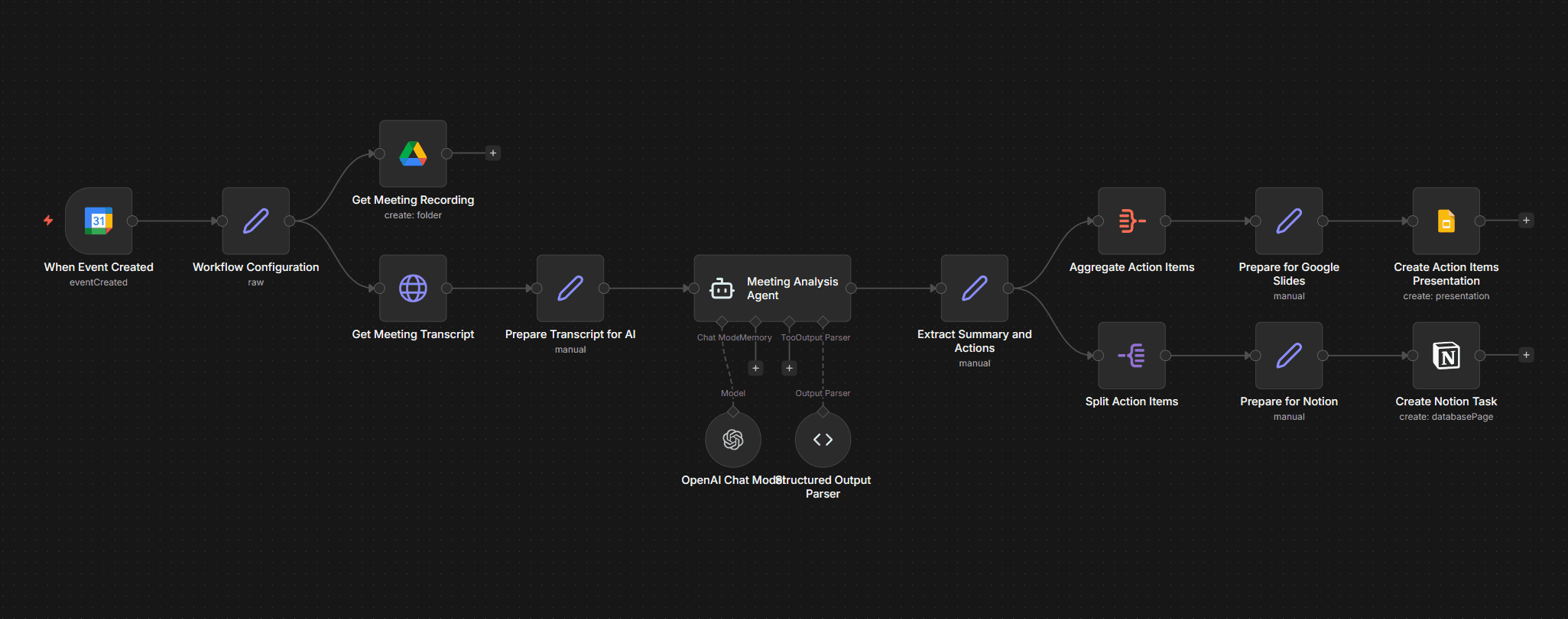 Today, my automated workflow can generate instant meeting summaries, produce full transcriptions, and automatically create tickets in Notion with clear action points. Those same action points are also structured into a Google Slides presentation for tracking and future sharing. It’s a small but tangible example of what an agent-driven workflow can look like in practice.