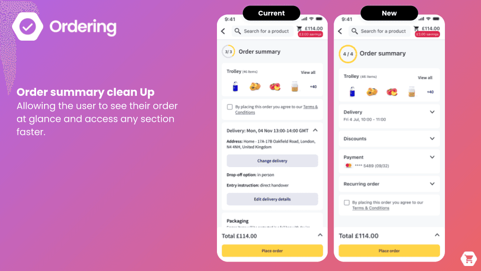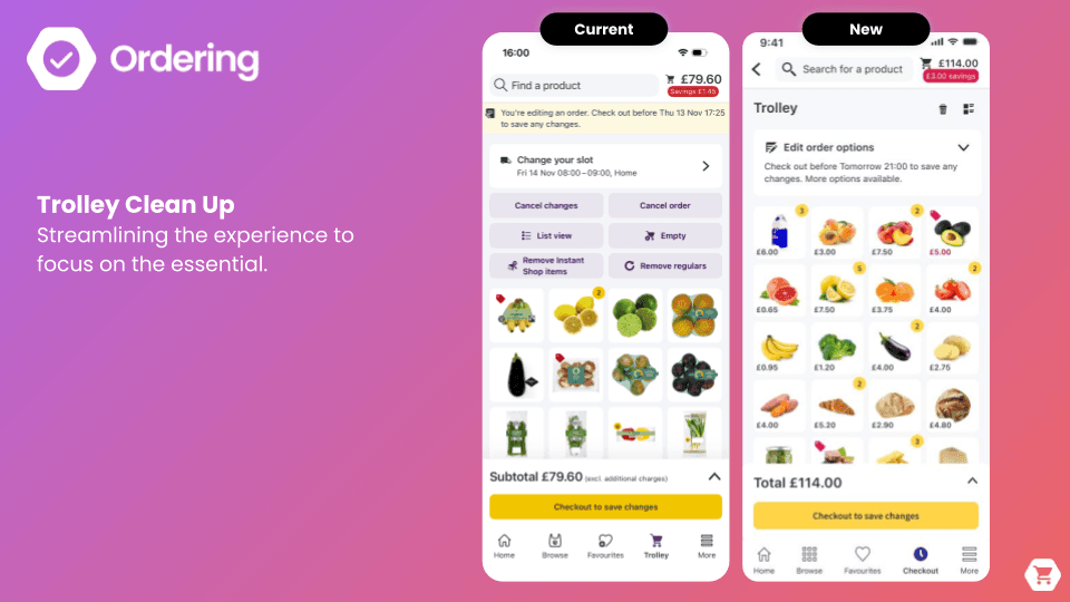 When I took ownership of the Trolley and Order domain in 2021, my focus was on simplifying the experience while making it more effective for both users and the business. Together with my team, we iterated extensively on the trolley page to surface more products upfront and significantly improve readability, helping customers understand their order at a glance.